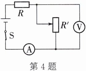 4. 如图所示,滑动变阻器$R'$的滑片在某两点间移动时,电流表的示数在1A到2A之间,电压表的示数在6V到9V之间。求定值电阻R的阻值及电源电压。