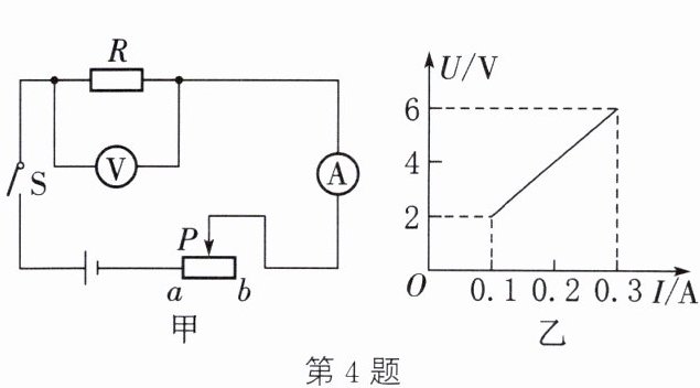 4. 如图甲所示的电路中,电源电压保持不变,闭合开关后,滑片P由b端滑到a端,电压表示数U与电流表示数I的变化关系如图乙所示,则定值电阻为