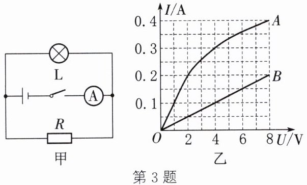 3. 将小灯泡L和定值电阻R接在如图甲所示的电路中,两者的I-U关系图像如图乙所示,其中图线