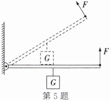 5. 如图所示,在长为$L$的轻质均匀杠杆的中点处悬挂一重物,在杠杆的最右端施加一个始终与杠杆垂直的力$F$,杠杆保持平衡。若不考虑杠杆的自重和阻力,则杠杆从水平位置向上转动过程中,拉力$F$的大小将 (