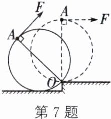 7. 如图所示,质地均匀的圆柱在拉力$F$的作用下由实线所示位置匀速转到虚线所示位置,整个过程中,拉力$F始终作用于A点且与OA$保持垂直($OA$为圆柱横截面的一条直径),圆柱在转动过程中不打滑。下列分析正确的是 (