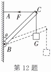 12. 如图所示,轻质细杆$BC可绕竖直墙上的B$点转动,末端$C$点挂一重物,重力为$200\ \text{N}$,拉力$F$始终沿水平方向,此时$\theta =45^{\circ}$,则拉力$F = $