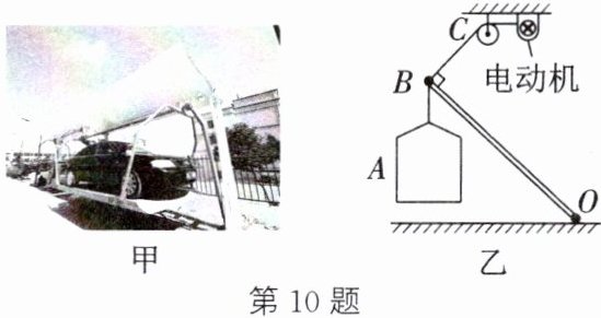 10. (2024·苏州姑苏校级期中)如图甲所示是“路边空中绿化停车亭”,其工作原理如图乙所示,电动机通过钢丝绳$BC牵引OB杆绕O$点转动,$B端悬挂停车架A$。取车时,将$A$从图乙所示位置(此时$OB\perp BC$)缓慢下放到水平地面的过程中,钢丝绳对$B$点的拉力 (