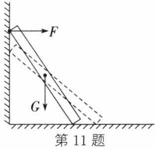 11. 一根粗细均匀的木棒斜靠在竖直墙壁上,墙壁光滑,地面粗糙,木棒受到的重力为$G$,墙壁对木棒的弹力为$F$,如图所示。现让木棒的倾斜程度变小一些至虚线所示位置,木棒仍能静止斜靠在墙上。与原来相比,$F$的变化情况为