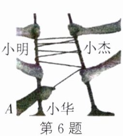6. (教材P14练习T2变式)小明和小杰握住两根较光滑的木棍,小华将绳子的一端系在其中一根木棍上,然后按如图所示依次将绳子绕过两根木棍,小明和小杰相距一定的距离握紧木棍站稳后,小华在图中A处拉绳子的另一端,用很小的力便能拉动他们。