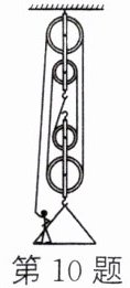 10. (2024·苏州工业园区段考)如图所示,吊篮的重力为400N,动滑轮总重力为50N,定滑轮总重力为40N,人的重力为600N,不计绳重与摩擦,人在吊篮里拉着绳子不动时需用力(