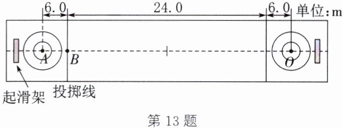 13. (2024·乐山)如图所示,某次比赛中,运动员推着冰壶从 A 点运动 6 m 到达 B 点时轻轻松手,随后冰壶沿冰道运动 30 m 停在 O 点。若运动员对冰壶的水平推力为 9 N,冰壶运动中受到水平方向的阻力,大小恒定为 1.5 N。从 A 点到 O 点冰壶沿直线运动,此过程中 (