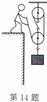 14. 如图所示,一工人用滑轮组提升重为 500 N 的物体,所用的拉力 $ F $ 为 200 N,物体以 0.2 m/s 的速度匀速上升了 10 s。(不计绳重和摩擦)
