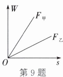 9. 用大小不同的两个力 $ F_{甲} $、$ F_{乙} $ 分别拉同一物体,两个力所做的功 $ W $ 与在这两个力的方向上移动的距离 $ s $ 的关系图像如图所示,由图可知,两个力的大小关系是 (