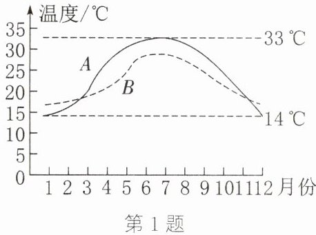 1. 如图所示为某一沿海城市和某一内陆城市年气温变化曲线。从图像可以看出,在一年中,曲线A所示的城市气温变化较