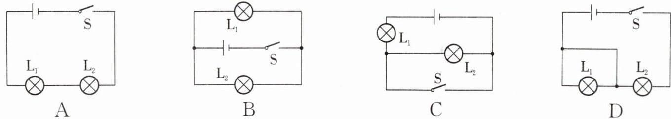 3. 下列电路中,当开关S闭合时,灯泡$L_1、$$L_2$组成的电路为并联电路的是(