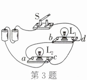 ($ ab $/$ cd $)即可;要使两灯并联,只要将与电池负极相连的导线的 $ c $ 端改接在a(或b)