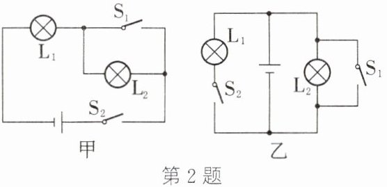 2. 如图甲、乙所示的两个电路中,当同时闭合开关 $ S_1 $、$ S_2 $ 后,图甲中观察到的现象是