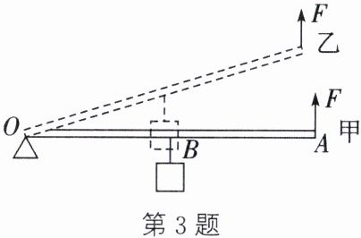 3. (2024·苏州吴江校级段考)如图所示,OA是一个质量分布均匀的杠杆,OA= 2m,O是支点,B是OA的中点,在B点悬挂一个G= 40N的重物。将杠杆从如图甲位置匀速提升到乙位置,重物上升的高度h= 0.3m,拉力F= 25N。