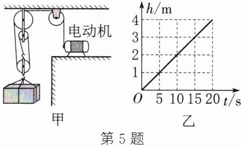 5. (2025·常州武进校级模拟)在建筑工地,用如图甲所示的滑轮组把建筑材料运送到高处。电动机用800N的力拉钢丝绳,在0~20s的过程中建筑材料上升的高度随时间变化的关系如图乙所示,滑轮组的机械效率为90%。求:
