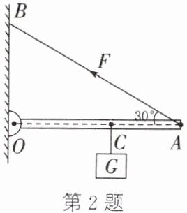 2. 如图所示,一轻质杠杆OA可绕O点无摩擦转动,A端用绳子系在竖直墙壁的B点,在杠杆的C点悬挂一重为20N的物体,杠杆处于水平静止状态。已知OA长50cm,OC长30cm,∠OAB= 30°。