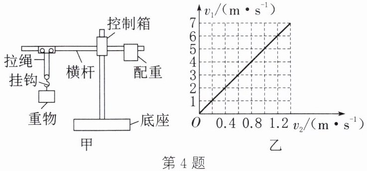 (2) 塔吊机将重物吊起后,还能将重物在横杆上左右移动。小温为了实现这一功能,他设计用电动机控制着此模型的重物和配重在横杆上左右移动,当挂钩和重物以$v_1$速度匀速移动时,另一端的配重也随之以$v_2$速度匀速移动,从而使横杆始终保持水平平衡。图乙为当重物质量为1.2kg时$v_1$与$v_2$的速度关系。请在该图上画出当重物质量为0.4kg时$v_1$与$v_2$的速度关系图。(忽略横杆本身重力)