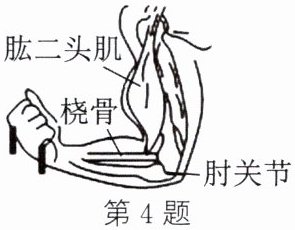 4. (2024·河南)人体中有很多结构可简化为杠杆。如图,手提超物体时,桡骨在肱二头肌的收缩牵引下绕肘关节转动,这是一种