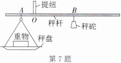 7. (2024·苏州姑苏校级期中)图中杆秤由秤盘、提纽、秤杆以及100g的秤砣构成。当不挂秤砣、秤盘中不放重物时,提起提纽,秤杆在空中恰好能水平平衡,已知AO间距离为10cm,杆秤的刻度线是