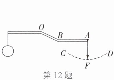 12. 如图为一可绕O点转动的杠杆,在A点通过绳作用一竖直向下的拉力F使杠杆平衡,此时AB部分水平,保持重物静止不动,而使绳绕A点从如图所示的位置沿图中的虚线CD转动,则(