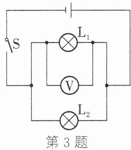 3. 如图所示,闭合开关 S 后,电压表的示数为 2.4 V,则灯$L_{2}$两端的电压为