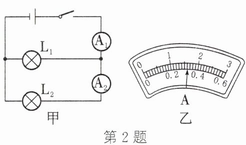 2. 在“用电流表测电流”的实验中,某同学连接成如图甲所示的电路。当开关闭合后,两灯都发光,两个电流表的指针所指位置均如图乙所示,则电流表$A_{1}$选用的量程是