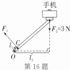 杠杆(O为支点),已知自拍杆长1m(质量忽略不计),手机对杆竖直向下的作用力$F_{2}= 3N$,图中$l_{1}= 10cm$、$l_{2}= 80cm$,则手垂直于杆的动力$F_{1}= $24