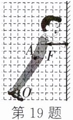 19. 某同学锻炼时,双脚并拢,脚尖O触地,脚后跟踮起,手掌支撑在竖直墙壁上,手臂水平,A为人体重心所在位置。此时墙壁对手掌的支撑力F如图,g取10N/kg,不计墙壁对手掌的摩擦力。