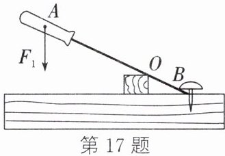 17. (教材P3材料改编)如图所示为用螺丝刀撬图钉的示意图,在图中画出动力$F_{1}的力臂l_{1}和阻力F_{2}$的示意图。