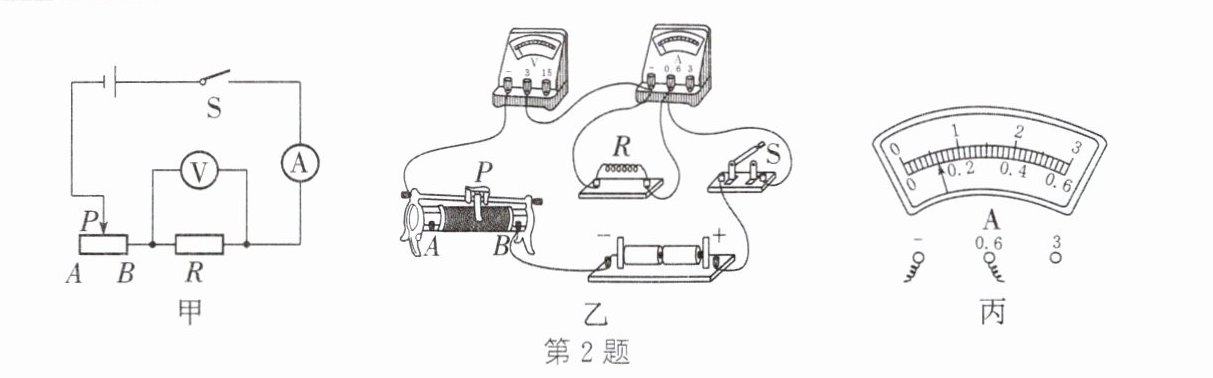 (3) 正确连接电路后,闭合开关,移动滑片,记录第1组电压表和电流表的示数后,为完成后续实验,应逐渐将滑片向____(A/B)端移动,数据记录如表。其中第3次实验时电流表的示数如图丙所示,读数为____A。