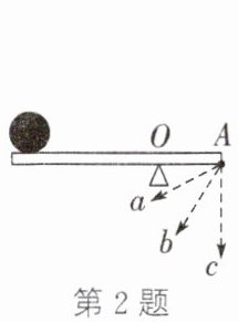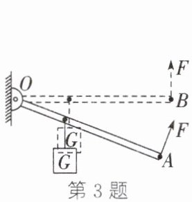3. 如图所示,在轻质杠杆上吊一重物G,在一端施加一个始终与杠杆垂直的动力F,使杠杆缓慢地从OA转至OB,则在转动过程中,杠杆的动力臂将