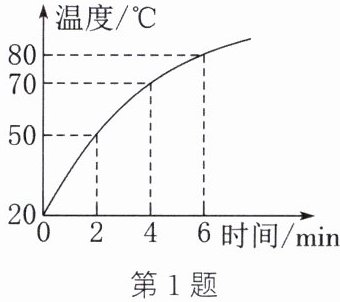 1. (2024·苏州工业园区校级二模)某物理兴趣小组的同学,用天然气给10 kg的水加热,同时绘制了如图所示的加热过程中水温随时间变化的图像,若在6 min内完全燃烧了0.12 kg的天然气(每分钟放热相同)。水的比热容为$4.2×10^3 J/(kg·℃),$天然气的热值为$5×10^7 J/kg。$
