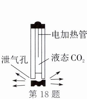 18.(2024·山西)二氧化碳($CO_2$)爆破技术是现代工程建设中非常环保的技术,起爆前高压泵将$CO_2$压缩成高压气体,液化后输入爆破筒内。如图所示,爆破时电加热管发热,使筒内的液态$CO_2$迅速汽化,形成的高压气体从泄气孔中喷出,实施爆破。下列说法正确的是(
