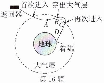 16.(2024·苏州工业园区校级模拟)我国已成功发射的嫦娥五号实现了中国首次月球无人采样返回。返回器使用类似“打水漂”的方式着陆地球,其着陆过程的部分轨迹简化为如图所示。关于此过程(只考虑空气阻力和重力的影响),下列说法正确的是(