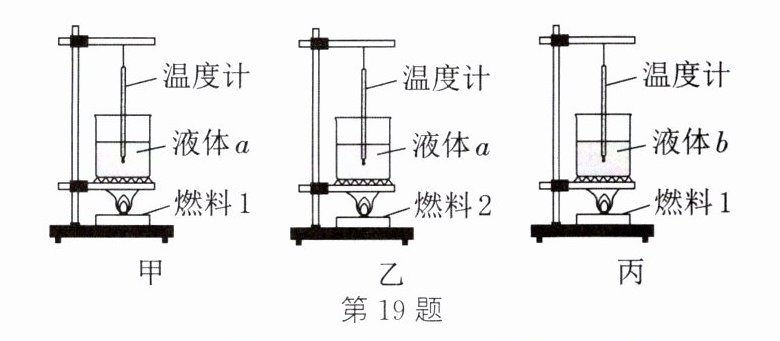 19.(2024·苏州工业园区校级二模)如图所示,甲、乙、丙三图中的装置完全相同,燃料的质量都是10g,烧杯内的液体质量和初温也相同。当燃料燃烧完时(烧杯内液体均未沸腾),立即读取相应温度计的读数,分别为$T_{甲}$、$T_{乙}$、$T_{丙}$,且有$T_{甲} > T_{乙} > T_{丙}$,下列说法中正确的是(