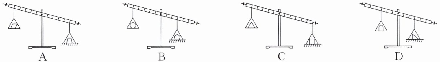 7. (2024·苏州姑苏校级期中)将若干重物放在4个自制天平的秤盘上,放入重物前天平在水平位置平衡,放入重物后天平都向右倾斜,秤盘最终落在桌面上,若不改变秤盘的悬挂位置,仅将重物左右互换,互换后可能重新在水平位置平衡的天平是(