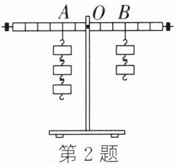 2. 如图所示,在均匀杠杆的A处挂3个钩码,B处挂2个钩码,杠杆恰好在水平位置平衡。下列操作中,仍能使杠杆在水平位置平衡的是(所用钩码均相同)(