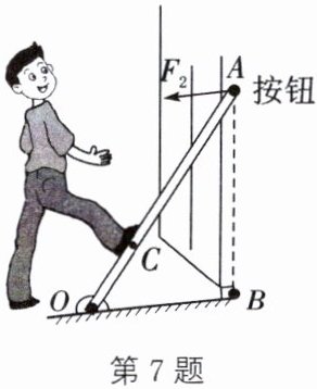 7. 为避免同学们用手按压宿舍楼大门的开门按钮造成交叉感染,小明用轻质木杆自制了“脚踏式杠杆”,借助杠杆按动按钮,如图所示,已知$OB= 60cm,AB= 80cm,OC= 15cm$,当小明在C点用脚给杠杆施加20N的压力$F_{1}$时,按钮触发,大门打开。