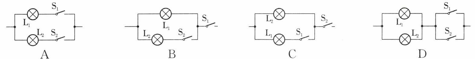 17. (2023·安徽)老师给小龙一个密封盒,其表面可见两个开关$S_1、$$S_2$和两盏灯$L_1、$$L_2。$为了探究开关和灯在密封盒内是如何连接的,小龙进行了如下操作:先闭合$S_1,$只有灯$L_1$发光;又闭合$S_2,$两灯都发光;再断开$S_1,$两灯都熄灭。符合上述实验结果的连接方式为 (