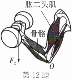 12. 如图所示,举着哑铃的前臂骨骼可看成杠杆,画出动力$F_{1}的示意图及阻力F_{2}的力臂l_{2}$。