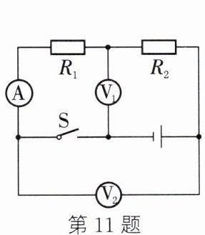 11. 如图所示,$R_{1}= 10Ω$、$R_{2}= 20Ω$,闭合开关S后,电压表$V_{1}$的示数为1V,则电流表A的示数应为