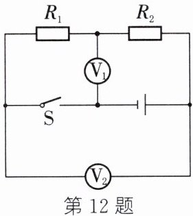 12. 如图所示,电阻$R_{1}$为3Ω,$R_{2}$为1Ω。当开关S闭合后,通过电阻$R_{1}$、$R_{2}$的电流之比为