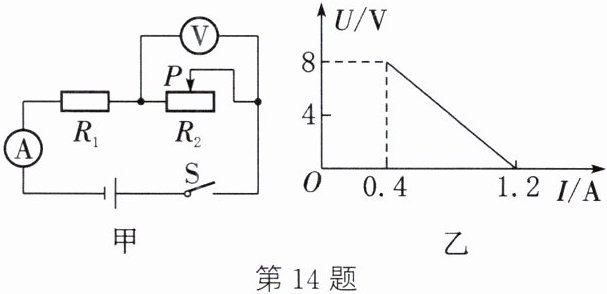14. (2024·天津滨海新区二模)如图甲的电路,$R_{2}$为滑动变阻器,电源电压保持不变。闭合开关S,在滑片P从最右端移动到最左端的过程中,电压表示数U与电流表示数I的关系图像如图乙所示。求: