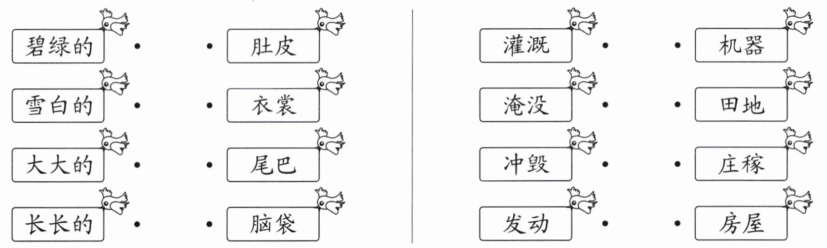 本题主要考查词语搭配,包括形容词与名词的搭配以及动词与名词的搭配。对于形容词与名词的搭配,如“碧绿的”通常用来形容颜色是绿色的事物,在给出的名词中“衣裳”可以是碧绿的,但“肚皮”更符合常见搭配,这里“碧绿的”应与“衣裳”的姐妹题“雪白的”与“肚皮”搭配(根据常见表述及逻辑,雪白的肚皮较为合理);“大大的”形容较大的事物,“脑袋”可以用大大的来形容;“长长的”形容长度较长的事物,“尾巴”是长长的。对于动词与名词的搭配,“灌溉”的意思是利用渠道或管道输水到农田,满足耕作及作物生长的需要,所以与“田地”搭配;“淹没”指大水等漫过,盖过,与“庄稼”搭配合理;“冲毁”指被水冲击而毁坏,与“房屋”搭配;“发动”有使机器运转等意思,与“机器”搭配。