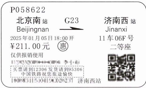 1. 北京南站 济南西站 2. G232025年1月5日18:00 3. 11车06F号