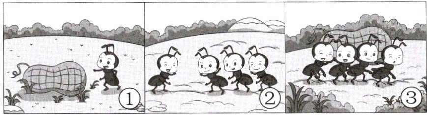 示例:一天,一只小蚂蚁在野外玩耍时发现了一颗大花生,它想把花生搬回洞里,可它使尽了全身力气也搬不动。它连忙回到洞里,请来几个同伴。它们同心协力,一起扛起大花生,一边扛一边喊着号子,一步一步地把大花生搬到洞里,然后一起尽情享受这顿美餐。