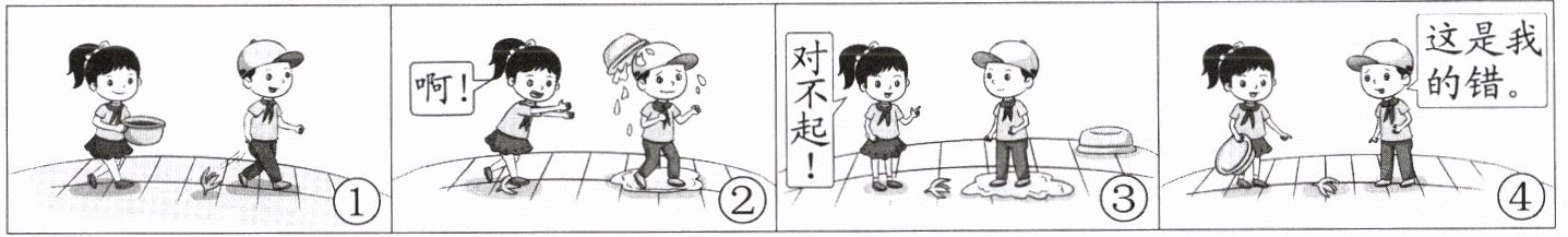 示例:一天,小明边走边吃着香蕉,吃完香蕉,随手把香蕉皮扔在了地上。小红端着一盆水走在小明的后面,一不小心踩在香蕉皮上,只听见“啊”的一声,小红脚下一滑,盆从手中摔了出去,正好砸在小明头上,把小明全身都淋湿了。小红见状,连忙对小明说:“对不起!”小明转过身来,看到地上的香蕉皮,红着脸说:“这是我的错。”