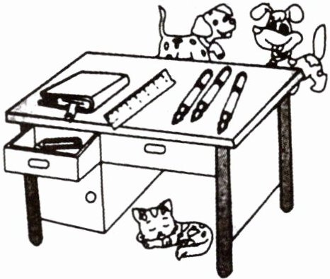 1. There is a ruler on the desk. 2. There are three pens on the desk. 3. There is a cat under the desk. 4. There are two dogs behind the desk. 5. There is a pencil in the desk.