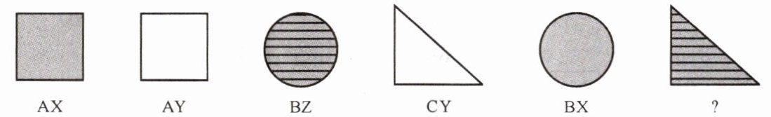 Look carefully at the shapes and codes given. Select the code which matches the shape given at the end of the line.(仔细观察所给图形和代码。选出代表这一行最后那个图形的代码。)