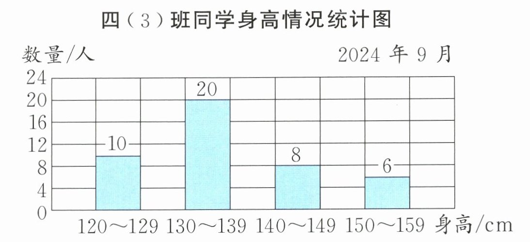 24. 下面是四(3)班同学的身高情况统计图。把这个班的同学按身高从高到矮排序,周林排第15位,那么他的身高在( )。